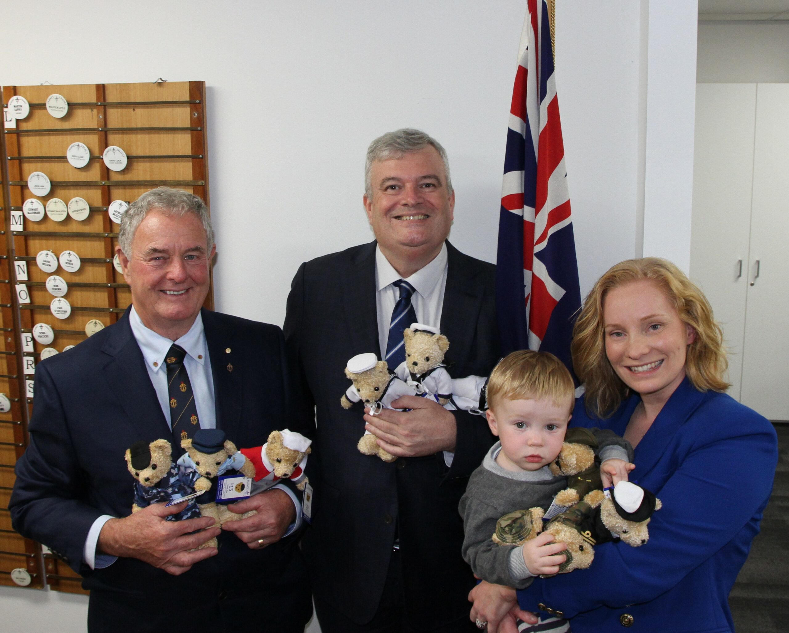 Legatee Eric Easterbrook, Chairman Legacy Australia (left) and Graham Boyd, CEO Legacy Australia (middle) and Sandi Laaksonen-Sherrin, Defence Family Advocate of Australia with Jack.